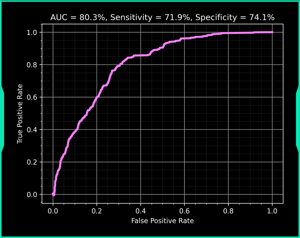 The accuracy on the test set calculated as area under the curve was 80.3% as shown in Figure 22.